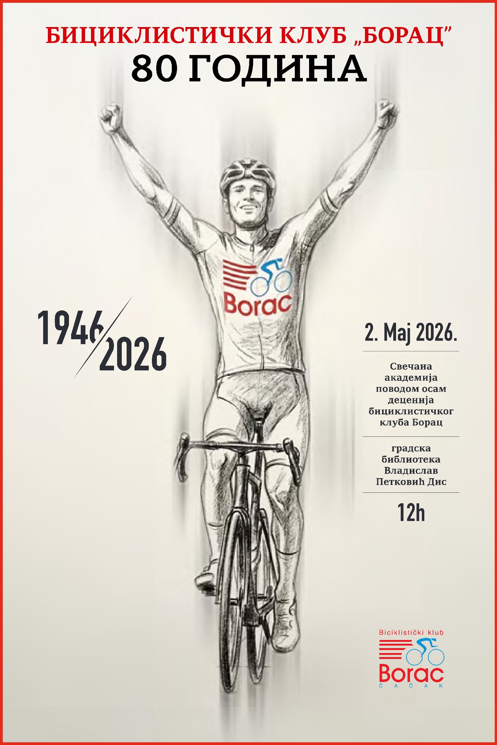 U subotu 02.05.2026.godine sa početkom u 12 sati u biblioteci Vladislav Petković Dis održaće se svečana akademija kluba u okviru koje će se predstaviti i monografija kluba. Monografija autora prof. Svetislava Markovića, obuhvata period od dolaska prvog bicikla u Čačak krajem 19-tog veka, preko osnivanja prvih biciklističkih udruženja u Čačku, osnivanja biciklističke sekcije u okviru fiskulturnog društva Borac do današnjih dana.
